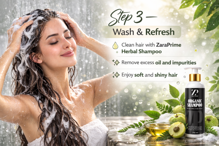 ZaraPrime Herbal Shampoo gently cleans your hair while keeping it healthy and strong.